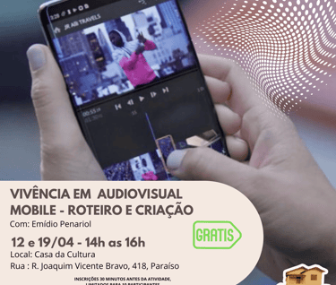 Os encontros aconteceram nos dias 12 e 19 de abril,das 14h às 16h, aos sábados, na Casa da Cultura. Durante os encontros, você vai descobrir como usar seu próprio celular para produzir conteúdo audiovisual, explorar técnicas de gravação, roteiro e edição, além de aprender estratégias de vendas, marketing pessoal e como transformar suas criações em renda extra ou até profissão!