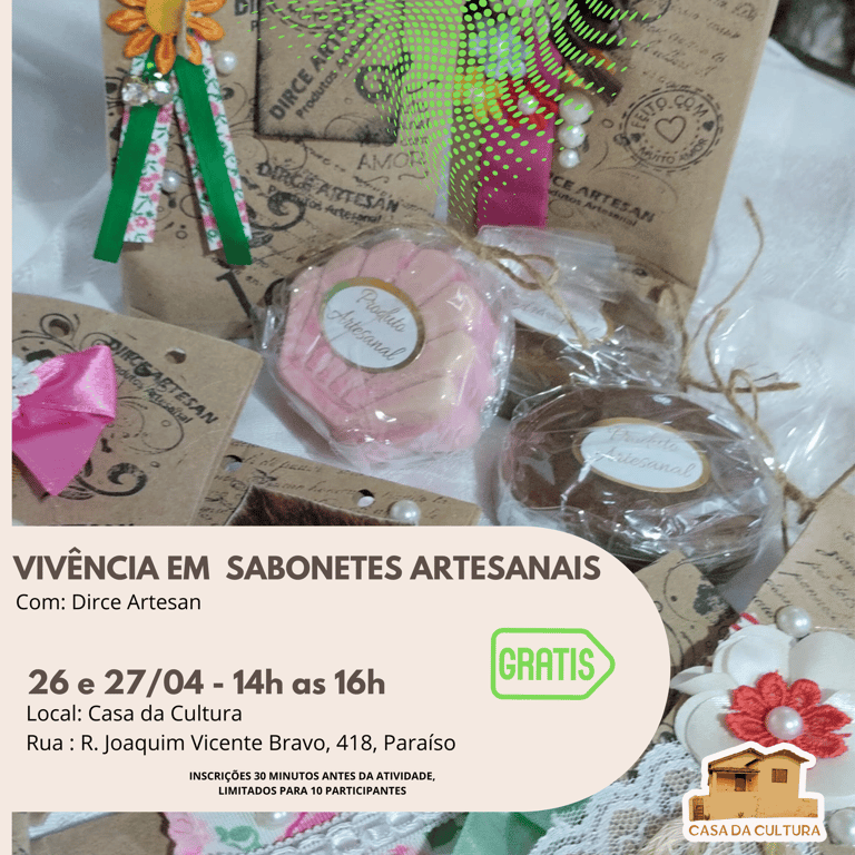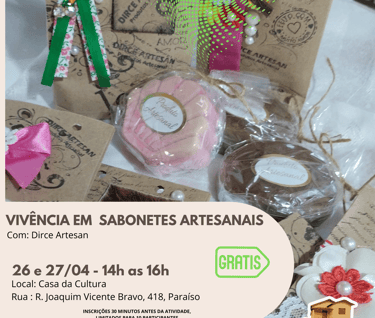 A Casa da Cultura tem o prazer de convidar a comunidade para participar da Vivência em Sabonetes Artesanais, que será conduzida pela artesã Dirce Artesan.